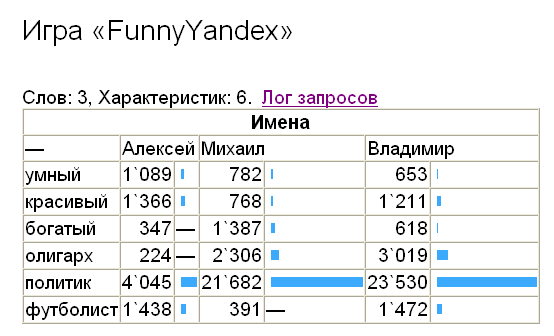 Давайте для примера введем несколько имен - например, Алексей, Михаил и Владимир, - а в качестве характеристик укажем: умный, красивый, богатый, олигарх, политик, футболист. Запускаем поиск. Получаем табличку: