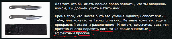 Согласитесь, утверждает Виктор, ведь так приятно поразить кого-нибудь из знакомых эффектным броском ножа прямо в горло.