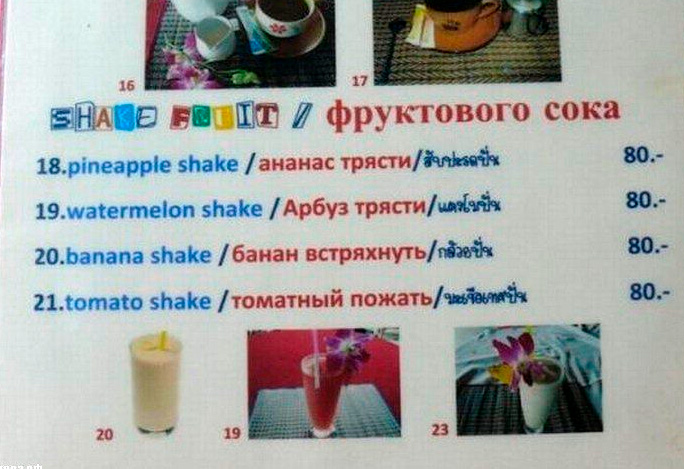 Сразу видно, замечает Гена Крокодил, что русский язык - очень богатый. Смотрите, сколько вариантов слова shake!