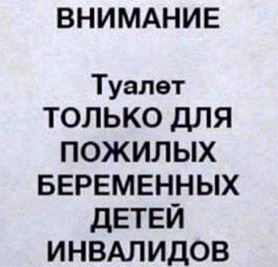 Какая безграмотная вывески, возмущается Andrevv. Очевидно, что правильно должно писаться: "Туалет только для пожилых беременных детей-инвалидов".