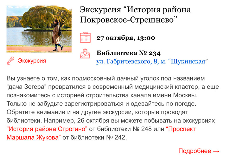 на иллюстрации к экскурсии по району Покровское-Стрешнево девушка прогуливается ровно в противоположном конце Москвы