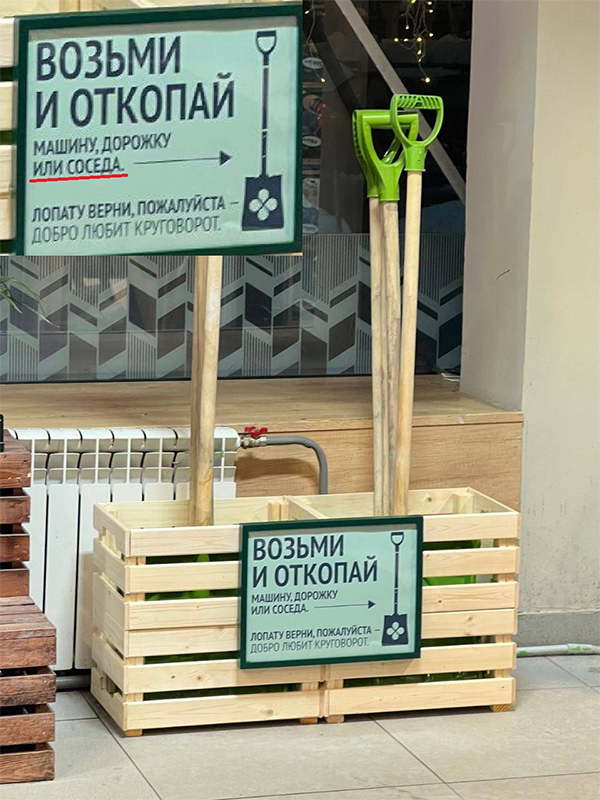 В "Перекрестке", рассказал Sad Smally, новая акция - предлагают взять на время лопату, чтобы откопать машину, дорожку или соседа. Зачем выкапывать соседа и что с ним потом делать - они не говорят.