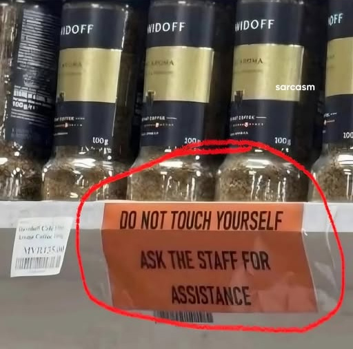 В этом магазине, радуется Олег, чрезвычайно любезные сотрудники. Надпись: "Не трогайте себя, просите помощи персонала".