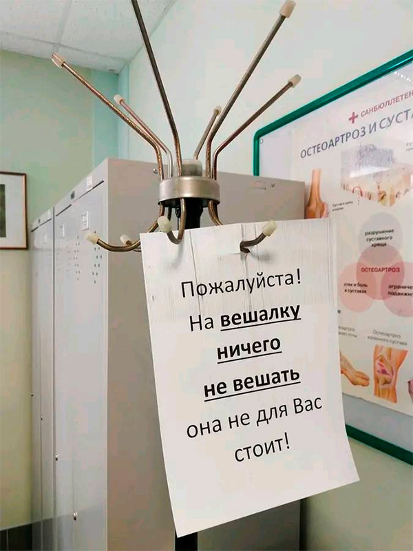 Это в питерской поликлинике, рассказала Ольга. Видимо, эта вешалка - важный элемент декора, задающий тон всему помещению.