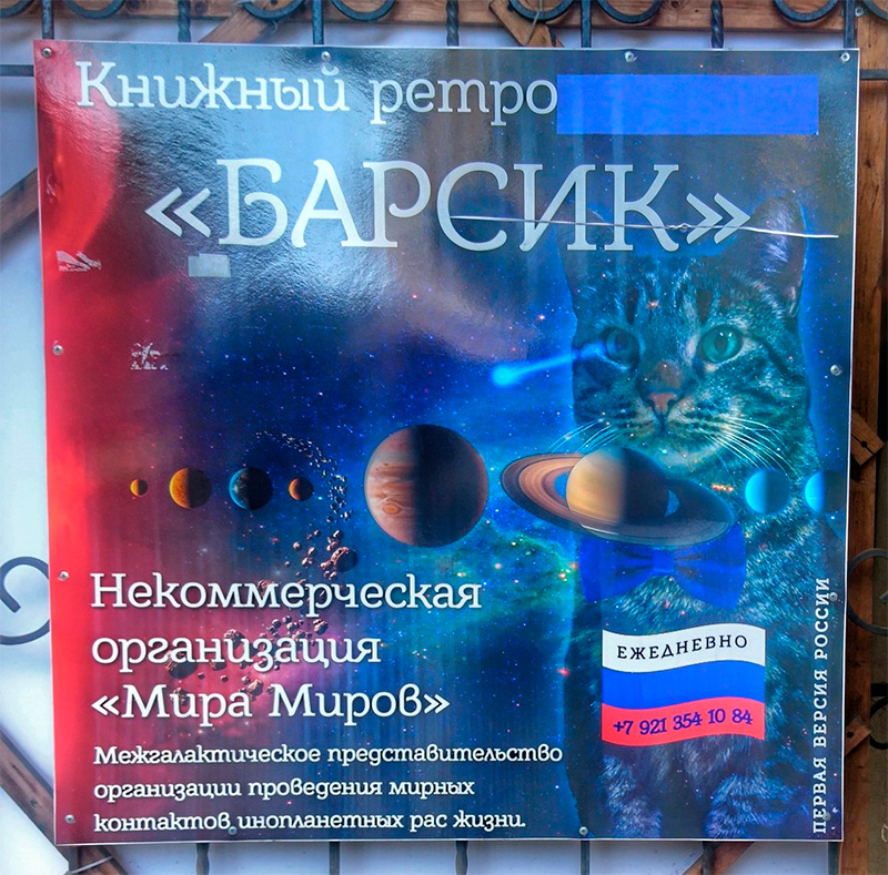 Артур прислал интереснейший плакат в надежде порадовать кота Бублика. Кот Бублик благодарен Артуру и, конечно, рад, что межгалактическое представительство выбрало такое название, но он обязательно позвонит по указанному телефону и расскажет, где можно купить галоперидола по сходной цене.