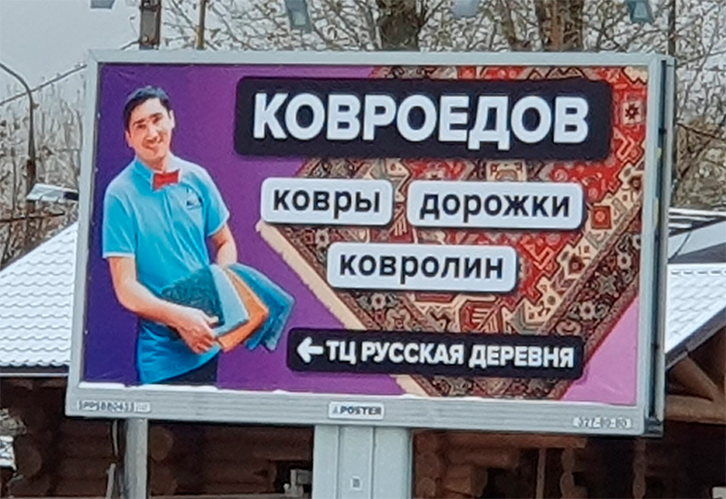 А этот что тут рекламирует? Он же ковроедов, ему самому нужно для питания. А-а-а-а, он не продает, а просто показывает! А потом это все сжирает на потеху русской деревни.
