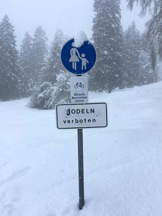 Альпийский юмор, рассказал Viktor. RODELN verboten («Кататься на санках запрещено») --> JODELN verboten («Петь с тирольскими переливами запрещено»)/