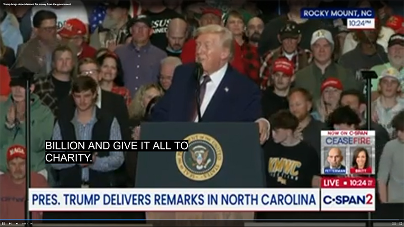 Однако вчера, выступая в Роки-Маунт, Северная Каролина, Трамп внезапно заговорил о сумме в 1 миллиард долларов, которую, по его словам, он пожертвует на благотворительность, если ее получит. А может, и не пожертвует.