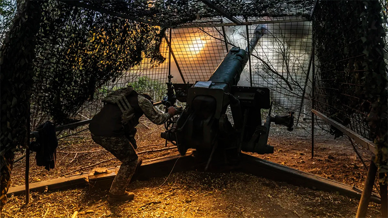 Украинские солдаты ведут артиллерийский обстрел в направлении фронта в Боровой, Украина, 4 октября. (Фотограф: Хосе Колон/Anadolu/Getty Images)