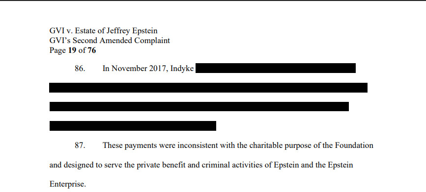 In November 2017, Indyke signed a Foundation check made payable to the immigration lawyer in New York who was involved in one or more forced marriages arranged among Epstein’s victims to secure a victim’s immigration status. The check’s memo line references the former Russian model’s last name.