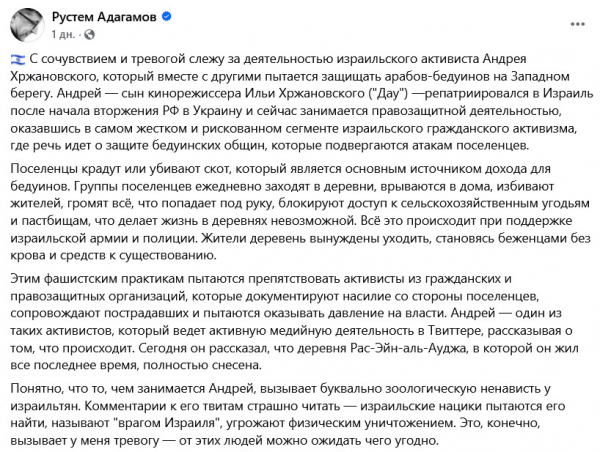 Но я вообще считаю, что Рустем лицемерит. Писать всякие бредни про Израиль в фейсбучике - много ума не надо. Я считаю, что ему нужно оторвать задницу от дивана и отправляться уже в Израиль, чтобы присоединиться к этому Хржановскому в его благородной борьбе. А то чего попусту языком-то болтать, правильно?