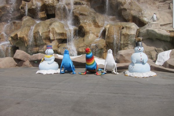 Идея аквапарка довольно забавная - "Заморозим пустыню". Поэтому внутри вокруг всякие "снега" и бесконечное количество совершенно психоделических пингвинов.
