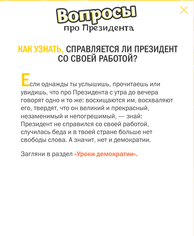 PS По нынешним временам сайт выглядит и читается совершенно немыслимо крамольным. Почитайте хотя бы раздел "уроки демократии": там подробно объясняют детям, зачем нужна оппозиция. Слова "свобода", "право", "жизнь", "счастье" на сайте есть. А слов "СВО", "Крым", "Донбасс" и "вонючие европейские подсвинки" - нет.