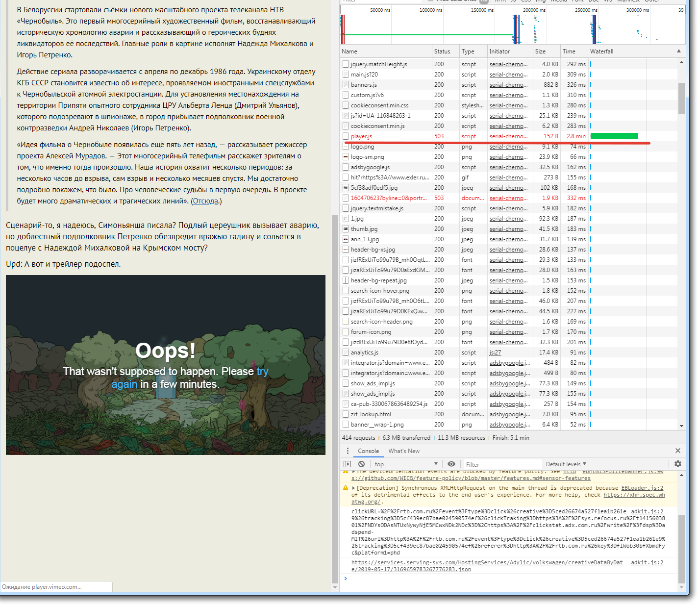 Забавный баг на сайте, относящийся к предыдущему посту (про сериал "Чернобыль"). По каким-то причинам видео или сам плеер были недоступны (в плеере текст"Oops! That wasn't supposed to happen. Please try again in a few minutes."), а сама страница не могла загрузиться (ждал пару минут). Поэтому оставляю коммент в этом посте, который грузится без проблем.