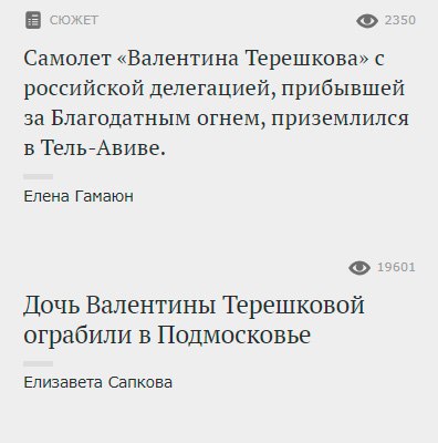Эти новости про Терешкову, человека и самолёт, с МК, если верить Олегу Бочарову.