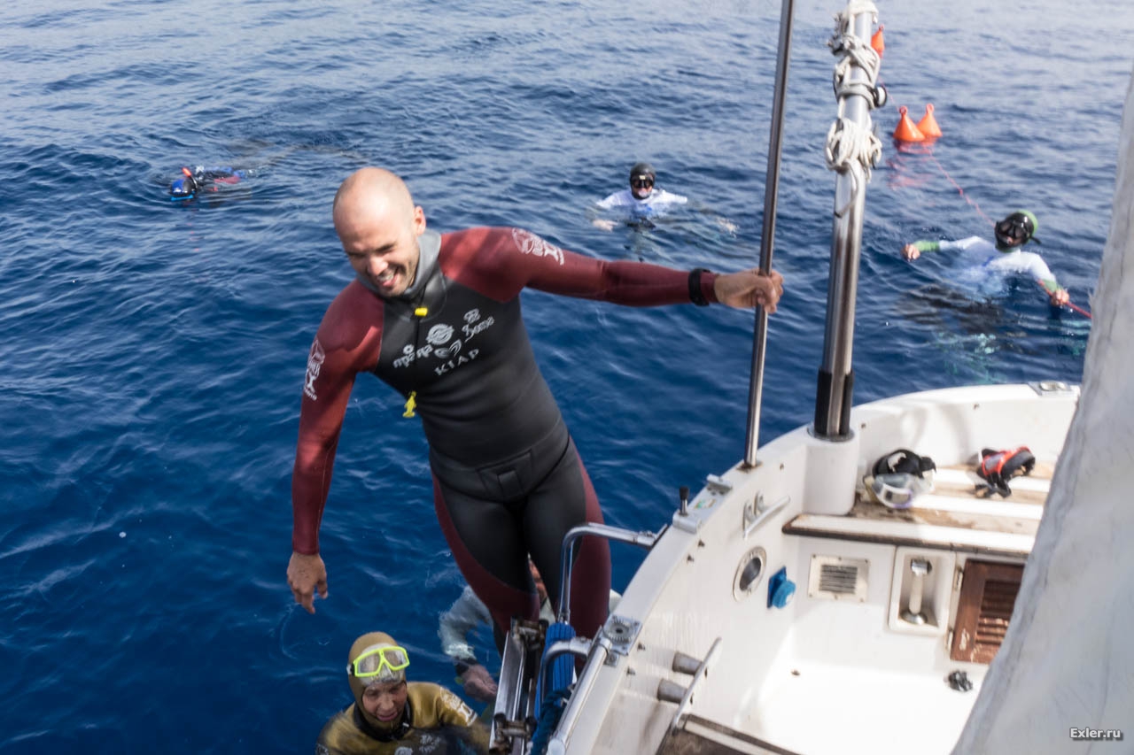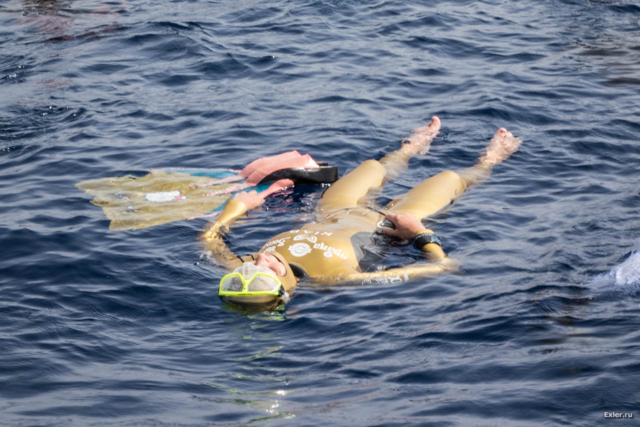 Видео финиша Натальи - она легко взяла 90 метров, завтра будет нырять на 93. Извините, что концовка видео смазана: Наталья попросила меня кинуть ее очки, которые она оставляла на катере, я нажал кнопку стоп и промахнулся. Заметил это только через несколько секунд. Но зато вы воочию можете наблюдать мою пробежку по катеру с точки зрения болтающейся на шее камеры.