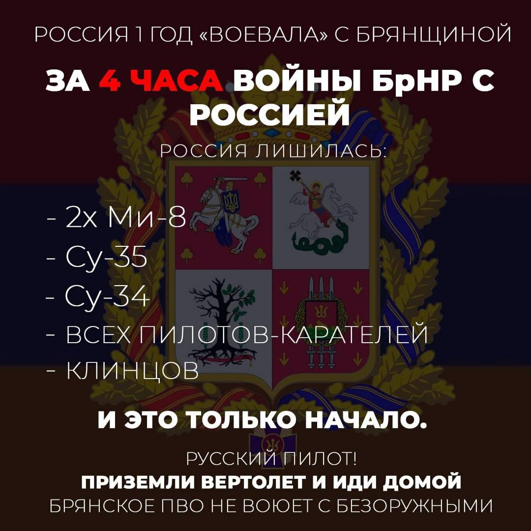 Многие телеграм-каналы и всякие официальные лица сообщили о четырех сбитых воздушных судах в Брянской области - это два вертолета Mi-8 и два штурмовика Су-34 и Су-35.