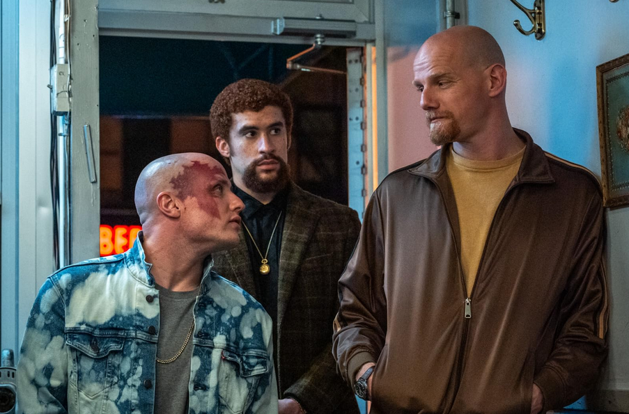 На фото ниже - Юрий Колокольников в фильме Даррена Аронофски "Пойман с поличным"(Caught Stealing) со своими партнерами по съемочной площадке: актером Никитой Кукушкиным и актером-певцом Bad Bunny.