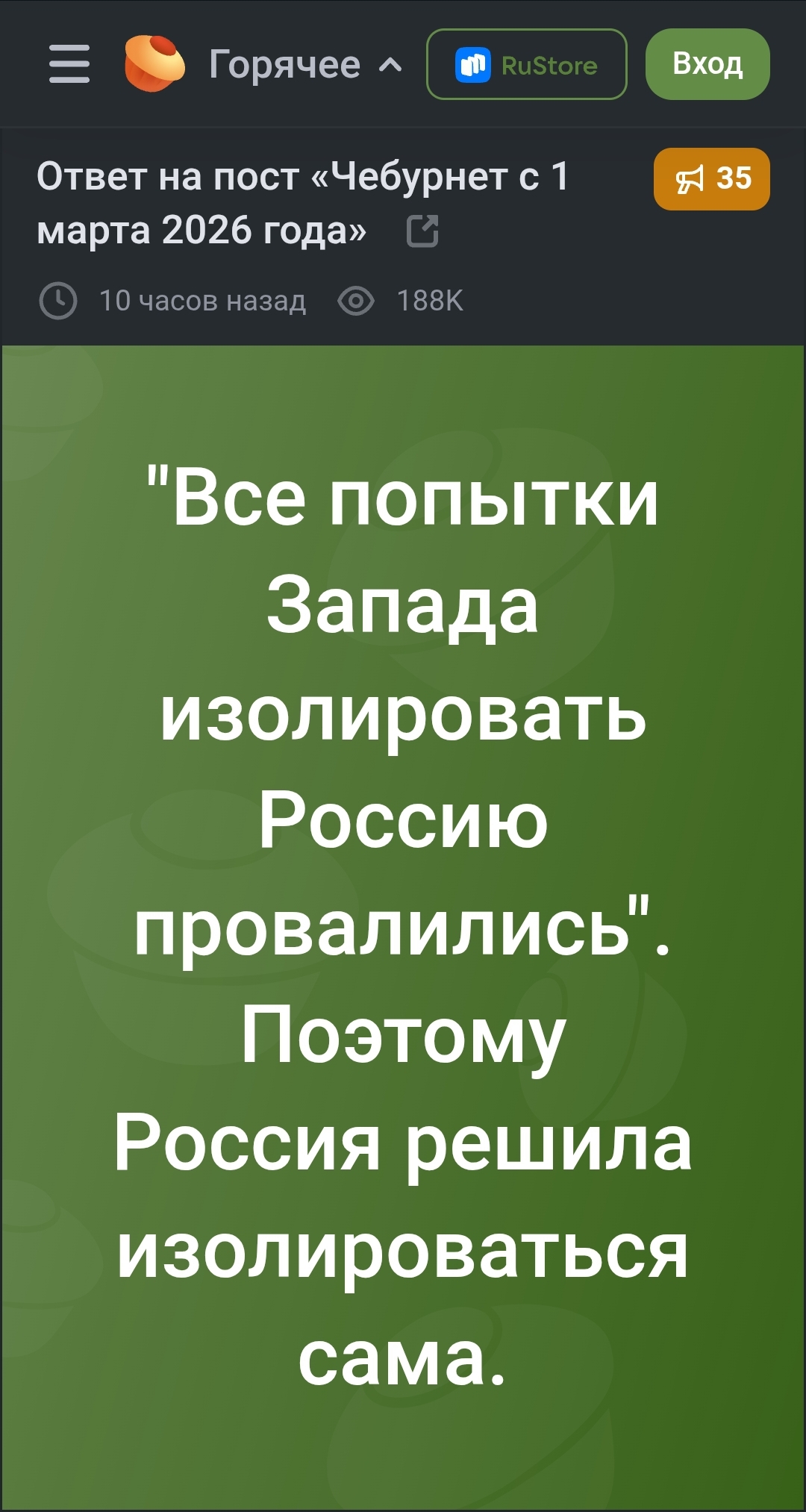 Как выяснили тщательные ( без пририсовок) соц.опросы, 24% россиян однозначно "за отключение РФ от мира", 30% данный вопрос безразличен. Еще 7% "затрудняются с ответом".
