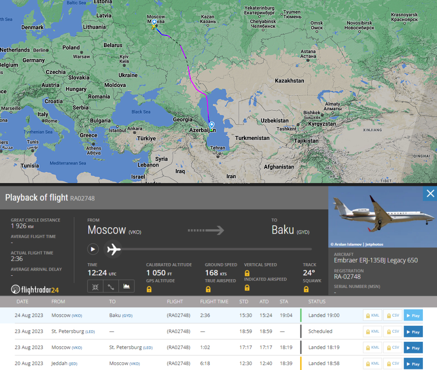 Сегодня в 19:00 по бакинскому времени, второй самолёт Пригожина RA–02748 приземлился в Баку.