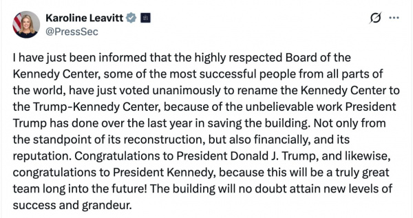 Только что мне сообщили, что уважаемый совет директоров Кеннеди-центра, в который входят некоторые из самых успешных людей со всего мира, только что единогласно проголосовал за переименование Кеннеди-центра в Трамп-Кеннеди-центр в связи с невероятной работой, проделанной президентом Трампом за последний год по спасению здания. Не только с точки зрения его реконструкции, но и с финансовой точки зрения, а также с точки зрения его репутации. Поздравляю президента Дональда Дж. Трампа, а также поздравляю президента Кеннеди, потому что это будет действительно великолепная команда на долгие годы! Здание, без сомнения, достигнет новых высот успеха и величия.