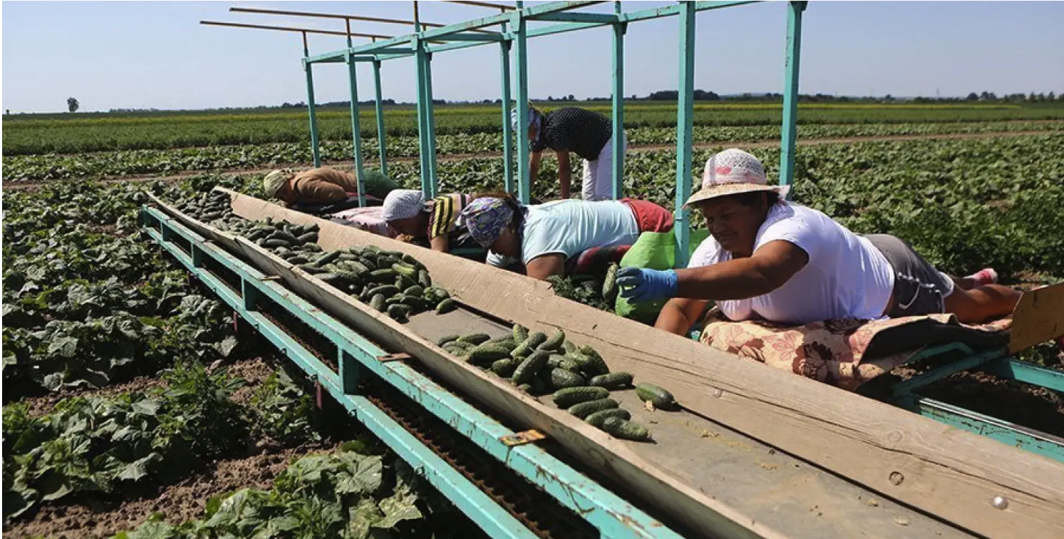 Капусту на таком же собирают. А перец с трёхметровых кустов собирают на многоэтажных тележках.