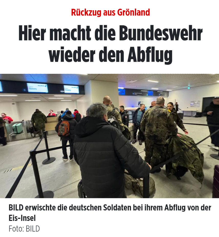 По данным издания, они могли покинуть остров после угрозы Трампа ввести дополнительные пошлины для Германии и ряда других европейских стран из-за Гренландии. Издание запечатлело вылет немецких военных из Нуука. Все встречи и мероприятия срочно отменили. (Отсюда.)