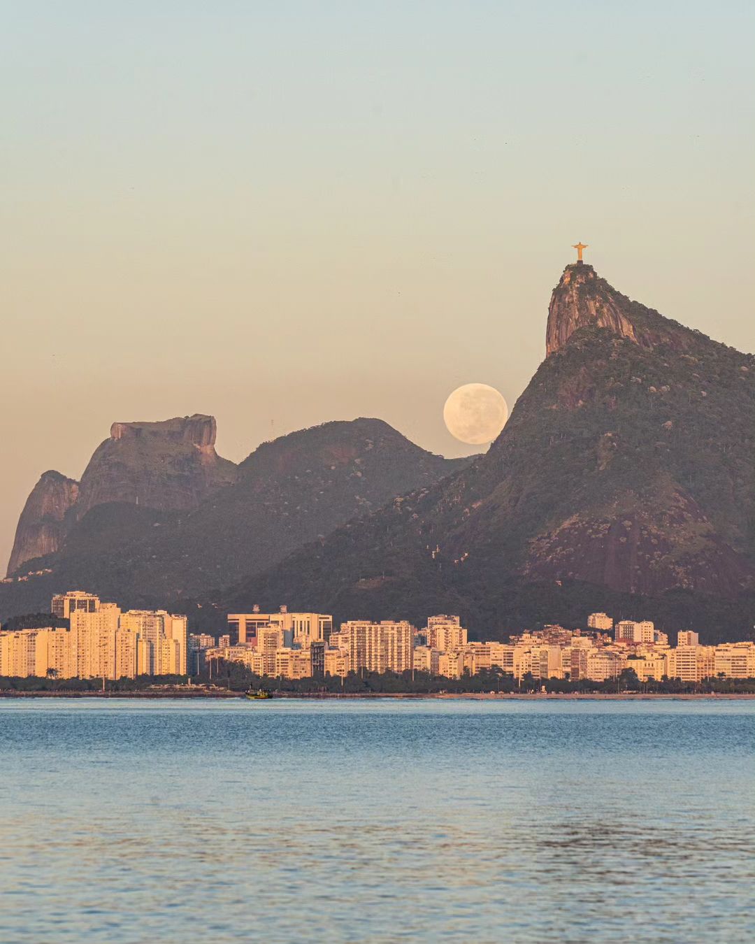 Для любознательных добавлю немного астрономии. Бразилия в Южном полушарии. Сейчас июнь. Солнце в Рио в полдень к северу от зенита. Во время от 6 до 7 утра солнце встает на востоке, а луна находится на западе (полнолуние). По фото видно, что движение луны по небу ближе к верикали, чем к горизонтали. Просто Рио ближе к экватору, чем мы.