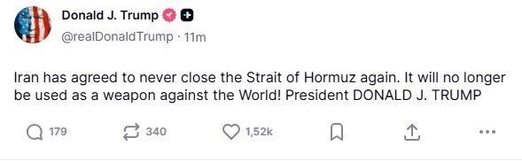 Вчера Трамп несколько раз объявил о том, что Иран согласился передать США весь обогащенный уран, открыл Ормузский пролив и пообещал больше никогда его не перекрывать.