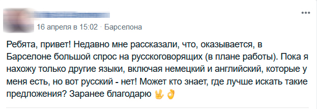 Обожаю испанские русскоязычные группы. Там иногда такая прелесть попадается. Оказывается, в Барселоне большой спрос на русскоговорящих - в плане работы. У местных безработица 25%, а русскоговорящих прям с распростертыми объятиями берут, особенно без испанского и каталанского.