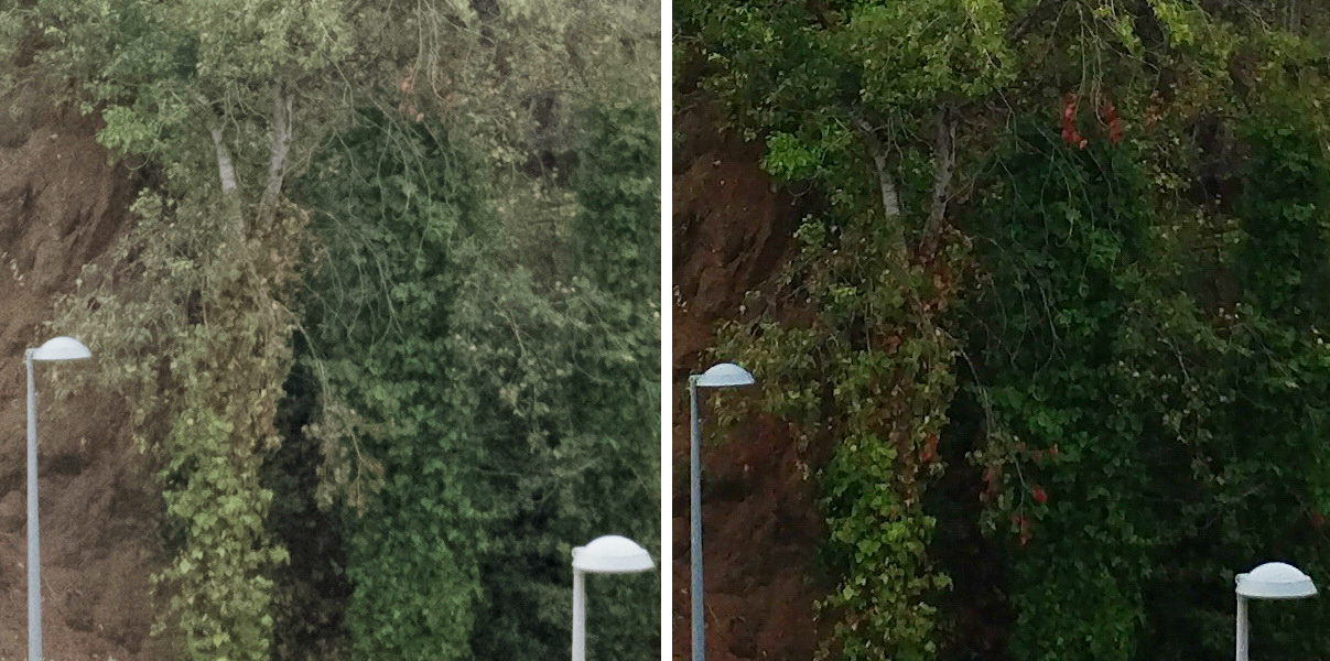 Но можно заглянуть в исходничек - слева RAW (проявка в Фотошопе без дополнительных настроек), сделанный на S8+, справа - он же в его JPG.