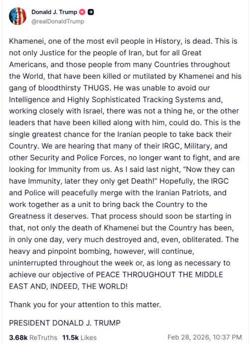Хаменеи, один из самых злобных людей в истории, мертв. Это справедливость не только для народа Ирана, но и для всех великих американцев, а также для людей из многих стран мира, которые были убиты или искалечены Хаменеи и его бандой кровожадных бандитов. Он не смог уйти от наших спецслужб и высокотехнологичных систем слежения, и, работая в тесном сотрудничестве с Израилем, ни он, ни другие лидеры, убитые вместе с ним, не смогли ничего сделать. Это единственный шанс для иранского народа вернуть свою страну. Мы слышим, что многие из их КСИР, военных и других сил безопасности и полиции больше не хотят воевать и ищут у нас иммунитета. Как я сказал вчера вечером: «Сейчас они могут получить иммунитет, а позже их ждет только смерть!» Надеюсь, КСИР и полиция мирно объединятся с иранскими патриотами и будут работать вместе, чтобы вернуть стране величие, которого она заслуживает. Этот процесс должен начаться в ближайшее время, поскольку не только Хаменеи погиб, но и страна за один день была в значительной степени разрушена и даже уничтожена. Однако интенсивные и точечные бомбардировки будут продолжаться без перерыва в течение всей недели или до тех пор, пока это будет необходимо для достижения нашей цели — МИРА НА БЛИЖНЕМ ВОСТОКЕ И, ФАКТИЧЕСКИ, ВО ВСЕМ МИРЕ!