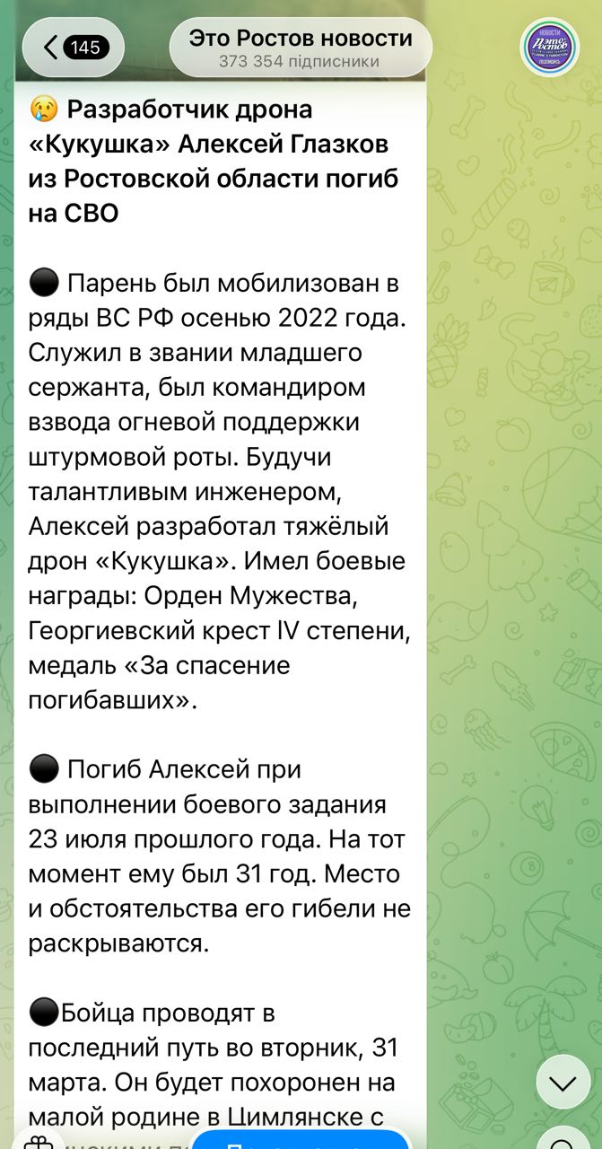 В Украине был ликвидирован 31-летний Алексей Глазков, инженер-разработчик дрона «Кукушка» из Ростовской области.