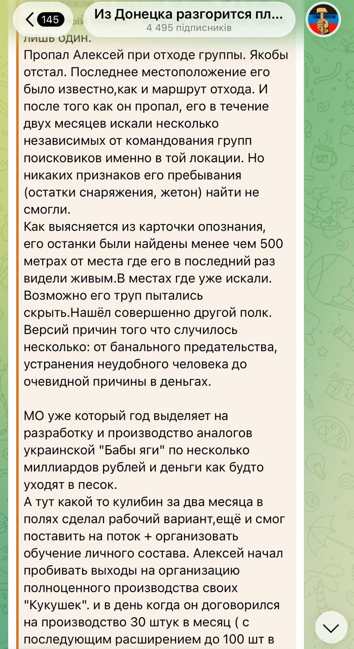А тут какой-то кулибин за два месяца в полях сделал рабочий вариант, ещё и смог поставить на поток + организовать обучение личного состава. Алексей начал пробивать выходы на организацию полноценного производства своих "Кукушек". И в день, когда он договорился на производство 30 штук в месяц, его забрали из лаборатории по приказу командира полка с позывным «Альфа».