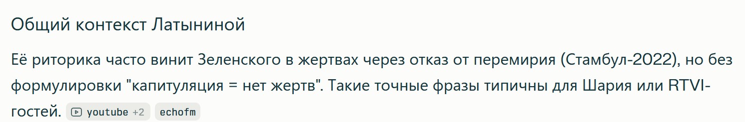 "Я не сильно вдавалась в то, что она говорит" - могу сказать то же самое про Латынину, только никакого желания потреблять ее, ни в фоновом режиме, ни в каком другом, у меня нет.