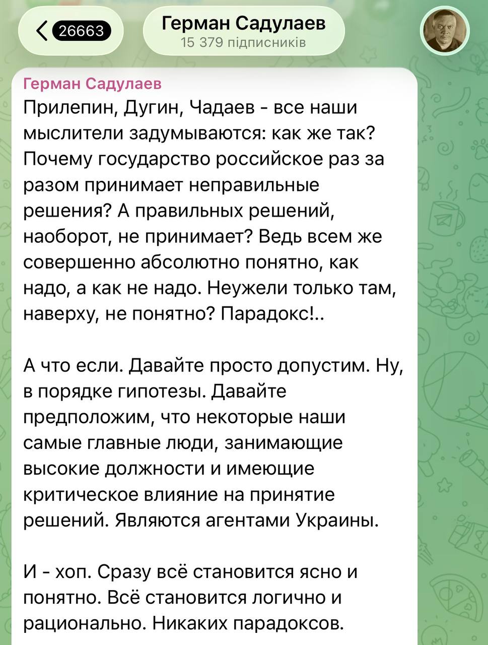 Такое чувство, что над нами что-то распылили, что у z-гнид вдруг приподоткрылись глаза на происходящее. В Телеге читаю канал Ивана Филиппова, он там собирает буквально вопли души z-блогеров и военкоров, в последнее время у них наступило прямо прозрение и даже озарение. Вот это прям прекрасно: