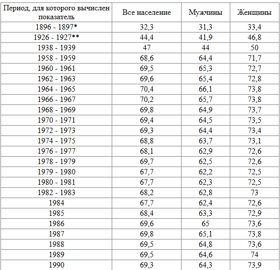 Лучший в РСФСР показатель по ожидаемой продолжительности жизни был зафиксирован в 1986-1987 годах, когда он впервые преодолел отметку в 70 лет (70,13 года). В частности, рост продолжительности жизни совпал с проведением в стране антиалкогольной кампании.