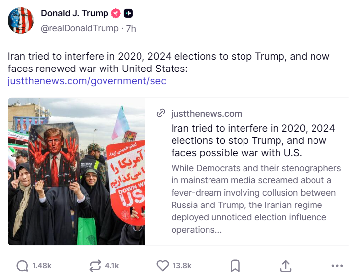 • Трамп выступил за смену режима, призвав иранцев «захватить власть в своем правительстве». Он также обвинил Тегеран в попытках восстановить свою ядерную программу после массированных ударов США летом прошлого года, которые, как он ранее заявлял, уничтожили объекты.