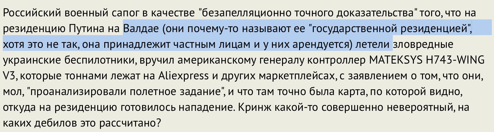 Российский военный сапог в качестве "безапелляционно точного доказательства" того, что на резиденцию Путина на Валдае (они почему-то называют ее "государственной резиденцией", хотя это не так, она принадлежит частным лицам и у них арендуется) летели зловредные украинские беспилотники, вручил американскому генералу контроллер MATEKSYS H743-WING V3, которые тоннами лежат на Aliexpress и других маркетплейсах, с заявлением о том, что они, мол, "проанализировали полетное задание", и что там точно была карта, по которой видно, откуда на резиденцию готовилось нападение. Кринж какой-то совершенно невероятный, на каких дебилов это рассчитано?
