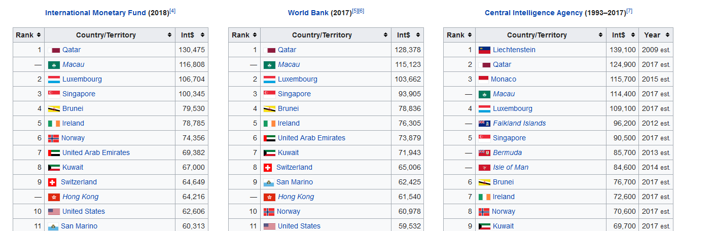 вот есть три разных источника GDP per capita, и что то не могу найти в первой пятерке