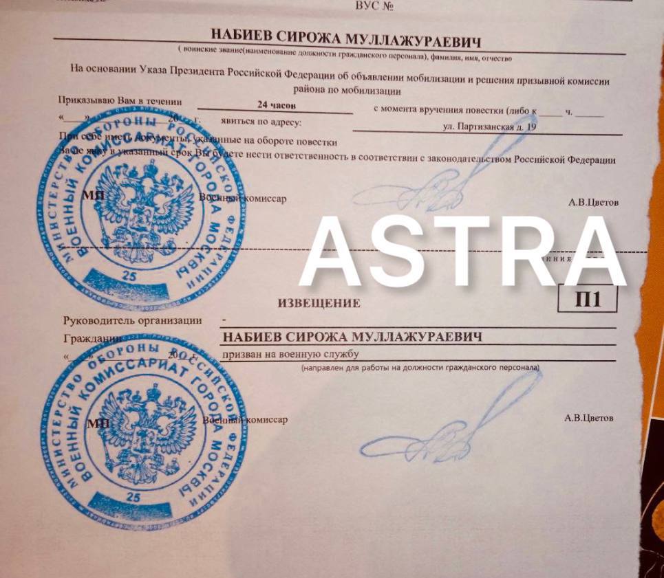 Сегодня прочитал что повестку в военкомат прислали гражданину Узбекистана Сирожу Набиеву который живет в Москве. У него нет не гражданства РФ, не вида на жительство.