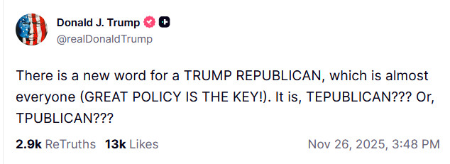 Есть новое слово для обозначения ТРАМПОВСКИХ РЕСПУБЛИКАНЦЕВ, к которым относится почти каждый (ВЕЛИКАЯ ПОЛИТИКА — ЭТО КЛЮЧ!). Это слово — TEPUBLICAN??? Или TPUBLICAN???