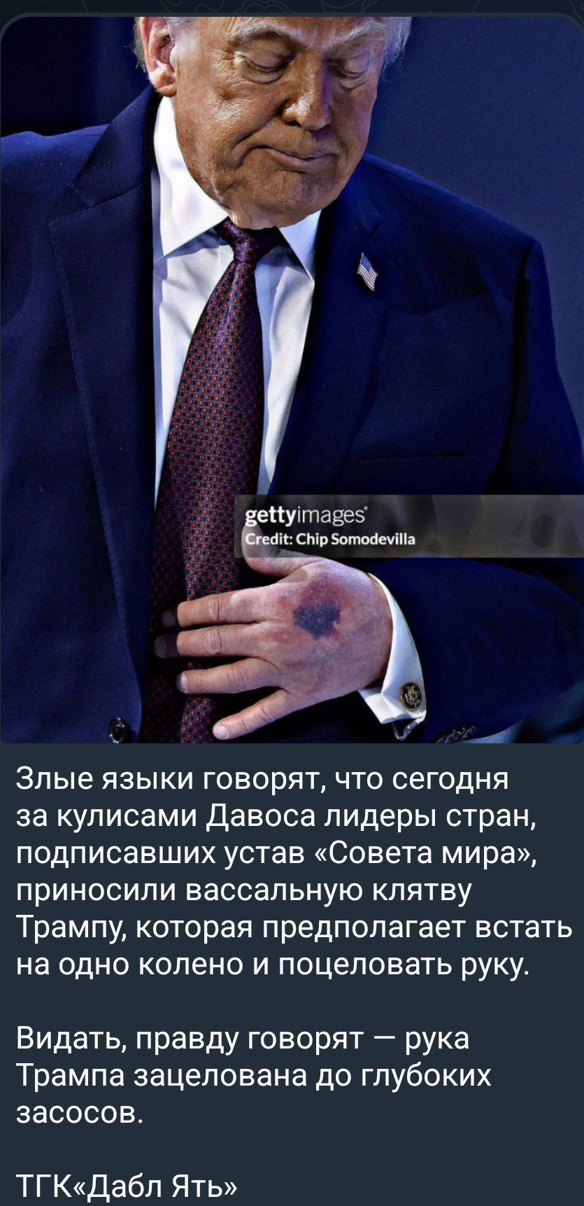 Ну что, в Давосе Трамп провел церемонию утверждения "Совета мира" имени Трампа, которым руководит Трамп, куда приглашает к участию Трамп, и где все решения принимаются большинством голосов при условии, что это утвердит Трамп. А если не утвердит, то решение не принимается. Если же есть решение Трампа, то большинство голосов уже не требуется, потому что это "Совет мира" Трампа.