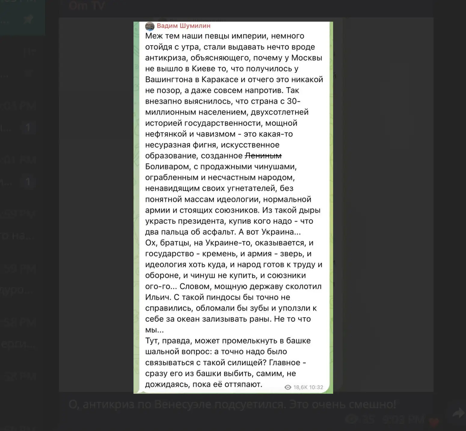 Всегда приятно послушать ответственно заявляющих "икспердов" с соловьевской помойки. Там такие ребята задействованы были, орлы! Мадуро принял правильное решение опереться об Россию-мать.