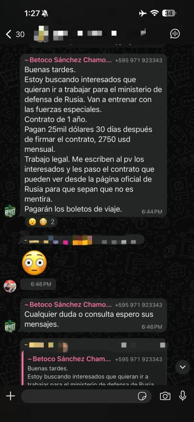 В нашу местную группу в WhatsApp переслали из парагвайской группы. Предлагают законную работу в РФ.