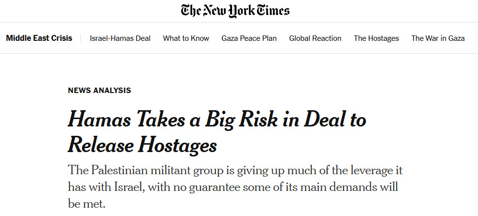 В издании The New York Times страшно переживают, что ХАМАС решил вернуть всех заложников. Рискуют они, говорят в издании. Видимо, им надо было себе хотя бы десяток оставить, чтобы было чем дальше торговаться. А так - сплошные риски.