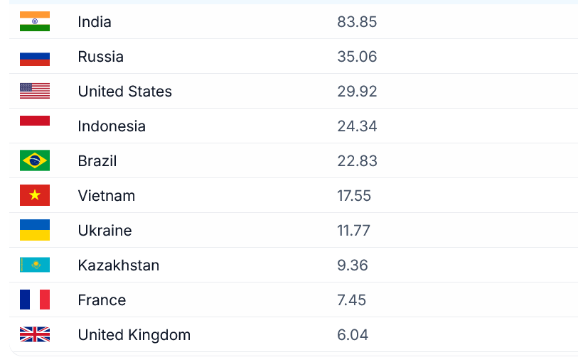 Странно, что Узбекистан не упомянут (возможно, просто данных не было). Тут ~25 млн пользователей Телеги, абсолютно вся "низовая" деловая активность, от вызова сантехника до поиска лекарств в аптеках, ведется в Телеграме.