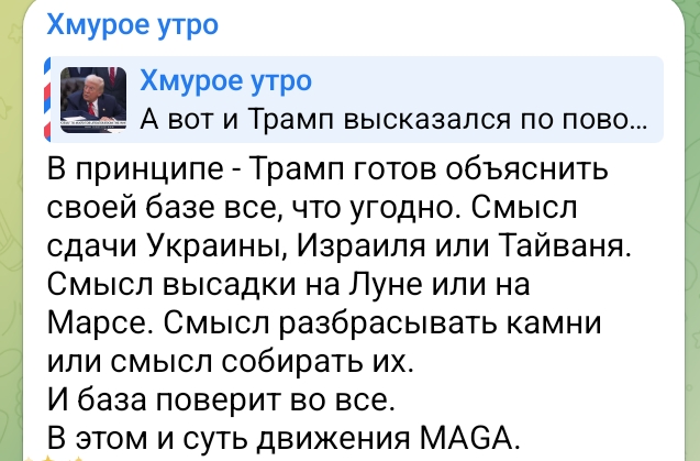 Трамп обещал окончить войну, но никогда не обещал окончить ее победой Украины, это я читающим