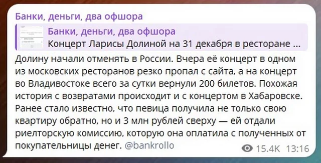 На концерте Долиной во Владивостоке собралось более 700 зрителей. Массово билеты никто не сдавал. Эту информацию подтвердили организаторы и источники редакции. На сегодняшнем выступлении в Уссурийске, по словам организаторов, возвратов тоже не будет.