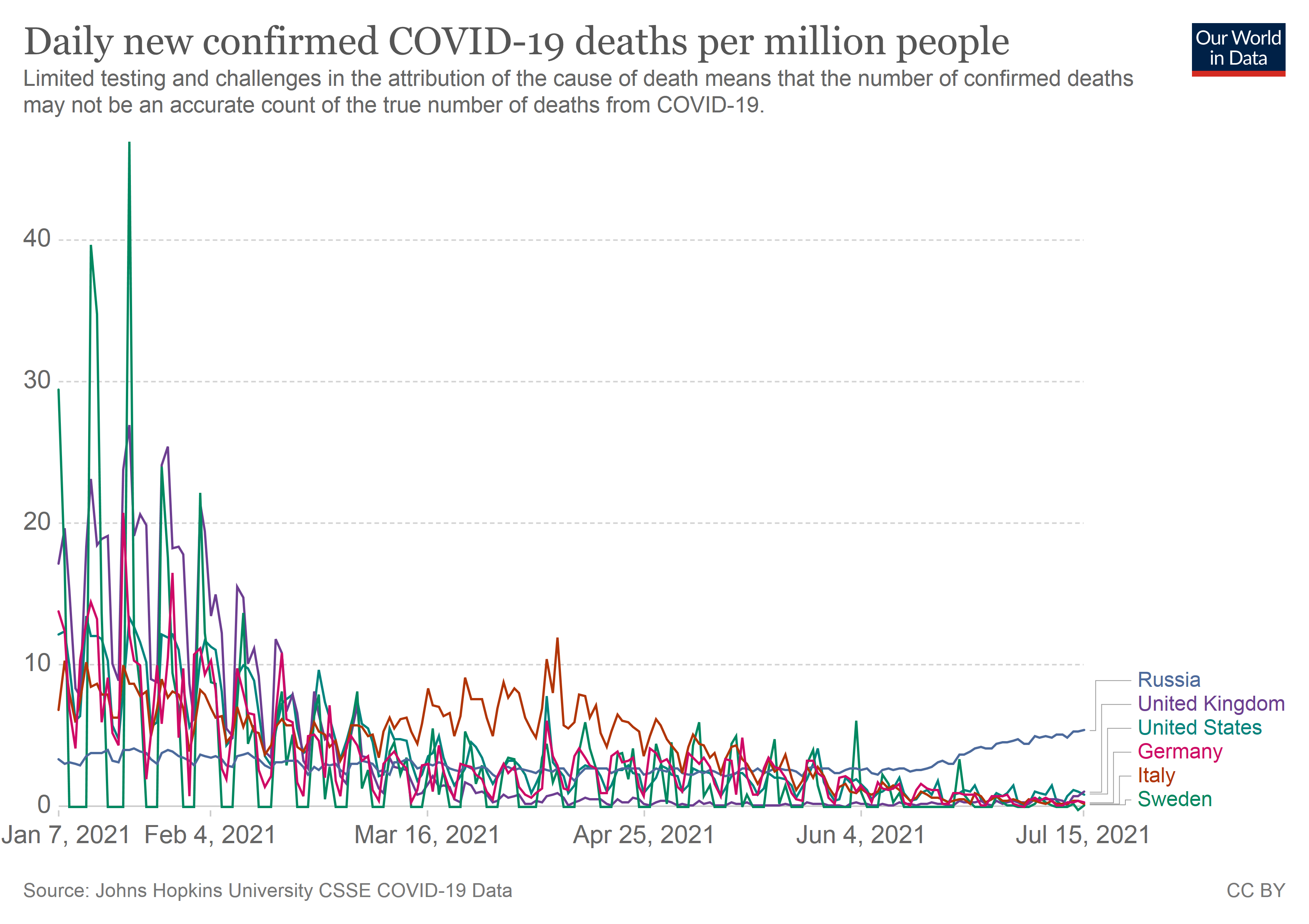 У вас умирают, потому что вы не воспользовались своим преимуществом в вакцинации. Укололи бы 60% россиян Спутником, начиная с группы риска, и люди не умирали бы в таких количествах.